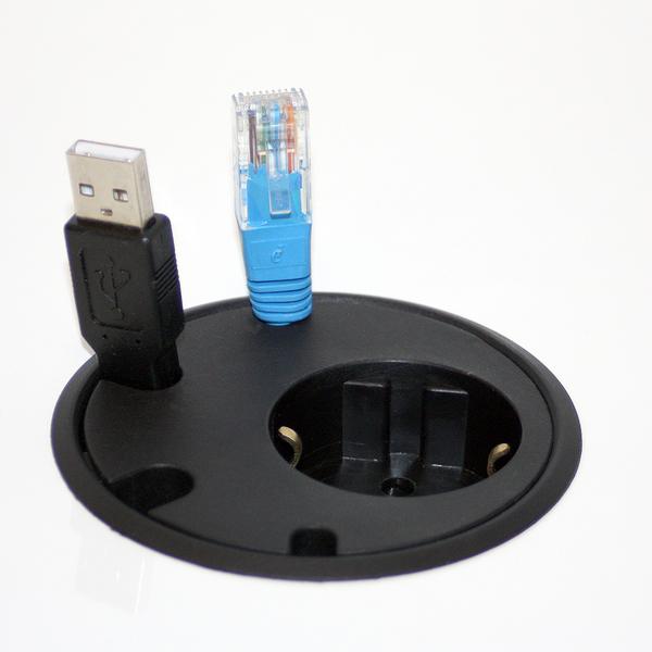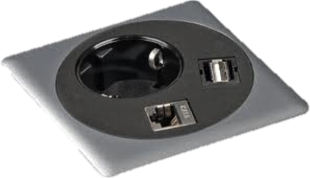 Tischanschlussfelder und Einbausteckdosen mit USB / HDMI / RJ45 / DVI / Audiocinch - Verbindungen, inklusive der passenden Stromleitungen mit GST18-Buchsen, Dreifach-Steckdosen, Vierfach-Steckdosen und konfigierbaren Steckdosenleisten mit Keystone-Adapter.