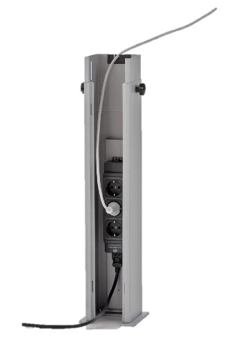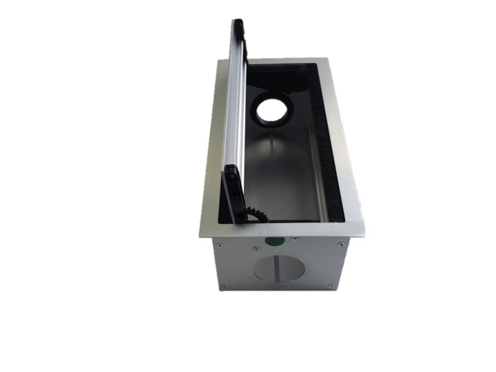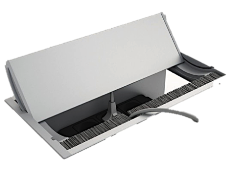 CPU-Halterungen und Bildschirmschwenkarme, bewegliche Monitorarme für Schreibtische, Kabeldosen aus Metall und Chrom, einbaubare Steckdosensysteme für die Tischplatte mit einem Einsatz für runde Kabelauslassöffnungen. Kabelboxen mit aufklappbaren Deckel.
